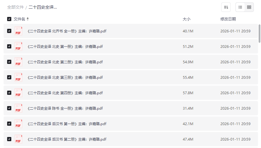 “二十四史”是中国古代正史的总称,记录了从黄帝到明末的漫长历史,是研究中华文明不可或缺的经典文献。本资源集合了 八十八册全译版本,由许嘉璐主编,涵盖《北齐书》《北史》《后汉书》《汉书》《旧五代史》《晋书》《金史》等全套史籍,将文言文原文与现代白话文翻译对照呈现,极大降低了阅读门槛。这套资源适合: