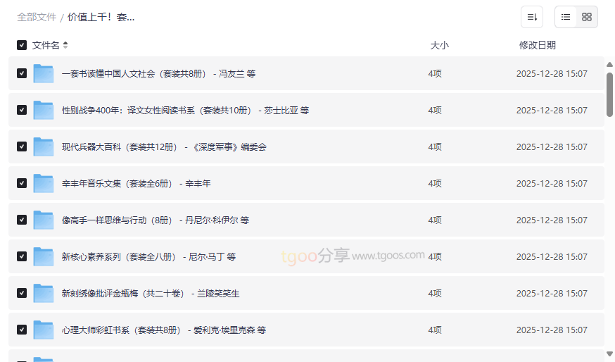 在信息爆炸的时代,一套系统、优质且经过筛选的电子书合集无疑是知识宝库。本次分享的“价值上千!套装电子书(53套)”网盘资源,正是这样一个精心整合的数字图书馆。它跨越了人文社科、历史典籍、心理自助、投资理财、科幻文学、经典小说等多个领域,每一套都是该领域的权威或畅销之作,总价值远超千元。本资源集合了 AZW3、EPUB、MOBI 三种主流电子书格式,适配 Kindle、iPad、手机及各类阅读器,为读者提供了前所未有的便捷与选择自由。这套高质量网盘资源合集尤其适合: