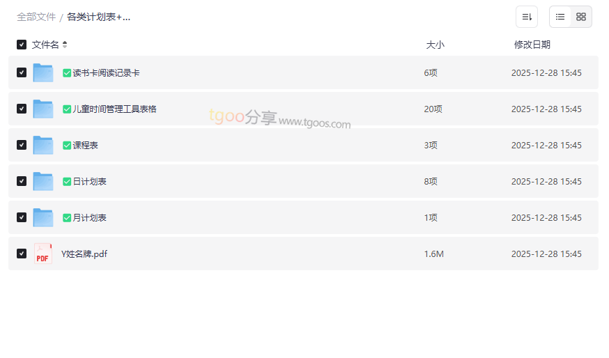 在快节奏的现代生活中,无论是孩子的学习成长,还是家庭的日常管理,一套系统、高效且充满趣味的规划工具都至关重要。本资源集合了专为儿童和家庭设计的 “各类计划表+姓名牌+阅读记录卡+时间管理工具表+课程表”,堪称一站式成长规划宝库。它巧妙地将时间管理、习惯养成、学习规划与阅读激励融为一体,通过可视化的清单和趣味打卡,帮助孩子建立秩序感、提升自主性,同时极大减轻家长的教育管理负担。这套高质量网盘资源合集适合: