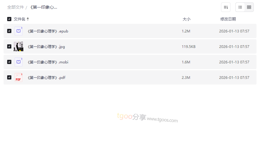在人际交往中,第一印象往往在几秒钟内就已形成,并产生深远影响。《第一印象心理学》正是这样一本深入剖析这一关键社交现象的经典读物。本资源集合了 EPUB、MOBI、PDF、JPG封面图 等多种格式的电子书文件,为读者提供了灵活、便捷的阅读选择。无论是想在通勤路上用手机阅读,还是想在电脑上做笔记,或是导入Kindle享受纸书般的体验,这份高质量网盘资源合集都能满足你的需求。它特别适合: