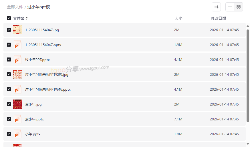 “过小年”是农历新年前的重要序曲,承载着丰富的民俗文化与节日温情。无论是企业年会、社区活动、学校课堂还是家庭聚会,一份精美、应景的PPT演示文稿都能为节日氛围增色不少。本资源精心整理了 5套风格各异、内容全面的过小年PPT模板,覆盖了习俗介绍、节日贺卡、主题汇报等多种场景。每套模板均包含可直接编辑的PPT源文件和高清预览图,设计精美、排版专业,助您轻松打造一场充满年味的精彩展示。这套高质量网盘资源合集特别适合: