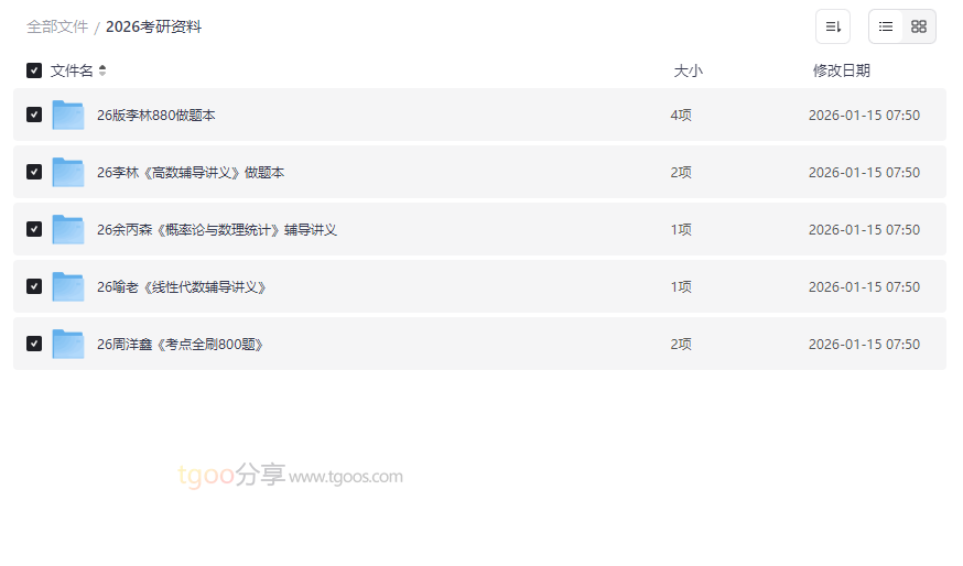 备战2026年考研,数学无疑是决定成败的关键科目之一。面对海量复习资料,如何精准选择、高效练习,是每位考研学子的核心关切。本资源集合了 李林、余丙森、喻老、周洋鑫 等考研数学名师的权威辅导讲义与习题集,覆盖高等数学、线性代数、概率论与数理统计三大模块,旨在为考生提供一套体系完整、重点突出、练习充分的备考解决方案。这套高质量考研数学网盘资源特别适合: