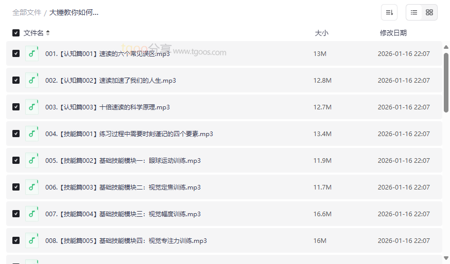 这是课程的精华所在,提供了从易到难、循序渐进的系统性训练方案。每个技能模块都配有详细的讲解音频和视觉训练图谱(JPG图片),方便学习者对照练习。亮点在于将抽象的速读能力拆解为具体的、可量化训练的子技能,如眼球运动、视觉定焦等,让提升过程清晰可见。