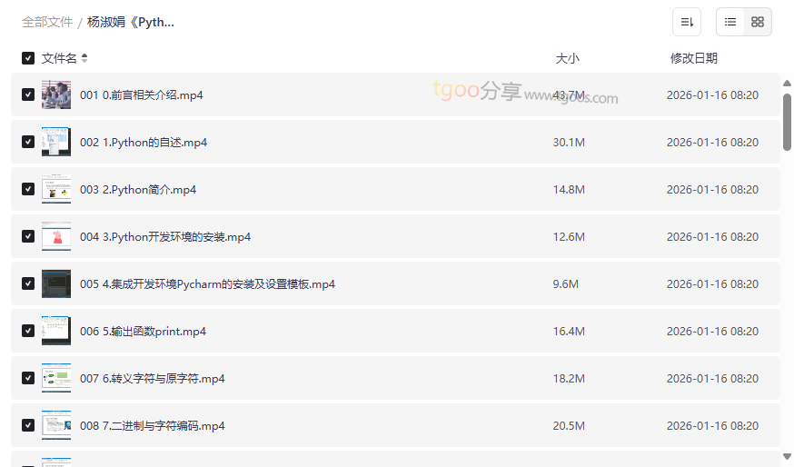 在数字化浪潮席卷全球的今天,Python编程语言以其简洁的语法、强大的功能和广泛的应用领域,成为初学者进入编程世界的首选。杨淑娟老师的《Python开发入门教程》正是为编程新手量身打造的系统性入门指南。本资源集合了 从环境搭建到基础语法,从核心概念到实战练习 的全套高清视频课程,内容循序渐进,讲解清晰易懂。这套高质量的Python入门网盘资源,将抽象的编程知识转化为直观生动的视频教学,是零基础学习者快速上手的理想选择。