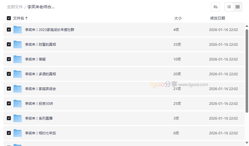 李笑来老师作为国内知名的投资人、作家和终身学习者,其思想体系深刻影响了众多追求个人成长与财富自由的个体。本资源合集堪称一座思想宝库,系统性地收录了李笑来近年来关于财富认知、家庭教育、学习方法、投资理念及人工智能应用等核心领域的课程与分享。内容涵盖《财富的真相》、《学习的真相》、《多语的真相》等重磅课程,以及《家庭成长年度社群》、《投资30讲》等系列直播与社群精华,旨在帮助用户打破思维局限,构建系统化的成长与财富框架。这套高质量网盘资源合集尤其适合: