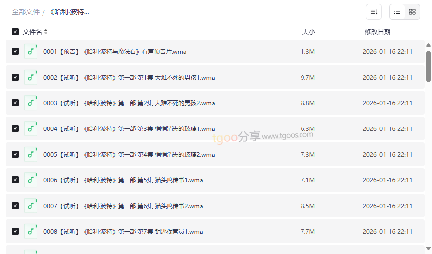 资源中特意保留了各部之间的精彩预告片和主题片花(如“魔法铁三角”、“魁地奇比赛”预告)。这些内容不仅起到了承上启下的作用,更能瞬间点燃收听兴趣,仿佛在收听一部专业的广播连续剧,提升了整体资源的制作水准与收听趣味性。 - 高兼容性音频格式,适用广泛