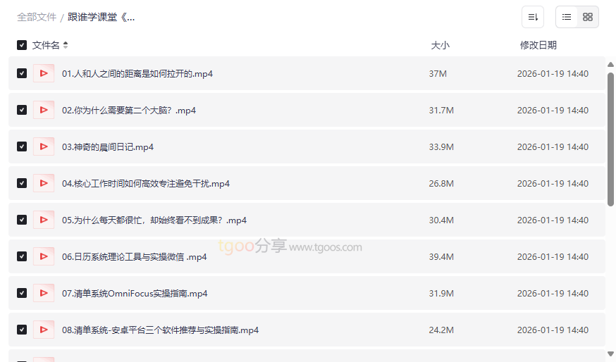 在快节奏的现代生活中,高效管理时间已成为个人成长与事业成功的关键能力。跟谁学课堂出品的《叶武滨时间管理10堂课》正是这样一套系统化、可实操的高效能人士必修课。本资源集合了 10节核心视频课程、多种实用工具模板(A4工作法、晨间日记)以及配套的实操练习音频,由知名时间管理专家叶武滨老师亲授,旨在帮助学习者从理念到工具,全方位构建属于自己的高效能系统。这套高质量网盘资源尤其适合: