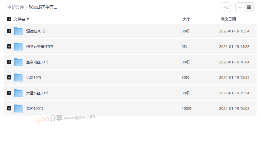 国学大师张其成教授倾心讲授的 “国学五经”系列课程,是深入中华文化核心的珍贵学习资源。本资源完整收录了张其成教授对《易经》、《黄帝内经》、《道德经》、《论语》、《六祖坛经》五部经典的系统讲解,共计近200节高清视频课程。这套课程以“易”贯五经,打通儒、释、道、医,旨在帮助学习者构建完整的中华传统文化知识体系,领悟国学智慧对现代人生的指导意义。这套高质量网盘资源合集适合: