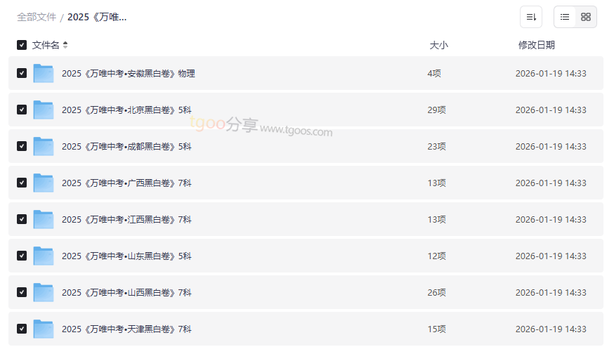“万唯中考•黑白卷”作为中考备考领域的权威模拟试题,以其精准的命题预测和高质量的解析而备受推崇。本资源集合了 2025年最新版《万唯中考•黑白卷》的安徽、北京、成都、广西、江西、山东、山西、天津等多个省市地区版本,覆盖语文、数学、英语、物理、化学、道法、历史、地理、生物等全科内容,并包含完整的白卷、黑卷、解析版答案、答题卡及重难点新考法专项资料。这套资源的价值在于,它将全国多地的中考模拟真题与深度解析融为一体,为不同考区的考生提供了极具针对性的冲刺训练方案,是考前查漏补缺、模拟实战、提升应试能力的高质量网盘资源合集,适合: