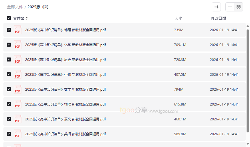 备战高考,知识体系是关键。2025版《高中知识清单》新教材版,正是为应对新高考改革、适应全国统编新教材而生的“知识宝典”。本资源集合了 语文、数学、英语、物理、化学、生物、历史、地理、政治 九大学科的全套PDF电子版,将高中三年庞杂的知识点进行系统梳理、图表化呈现,形成清晰的知识网络。这套高质量网盘资源不仅是教材的精华浓缩,更是高效复习的“导航图”,适合: