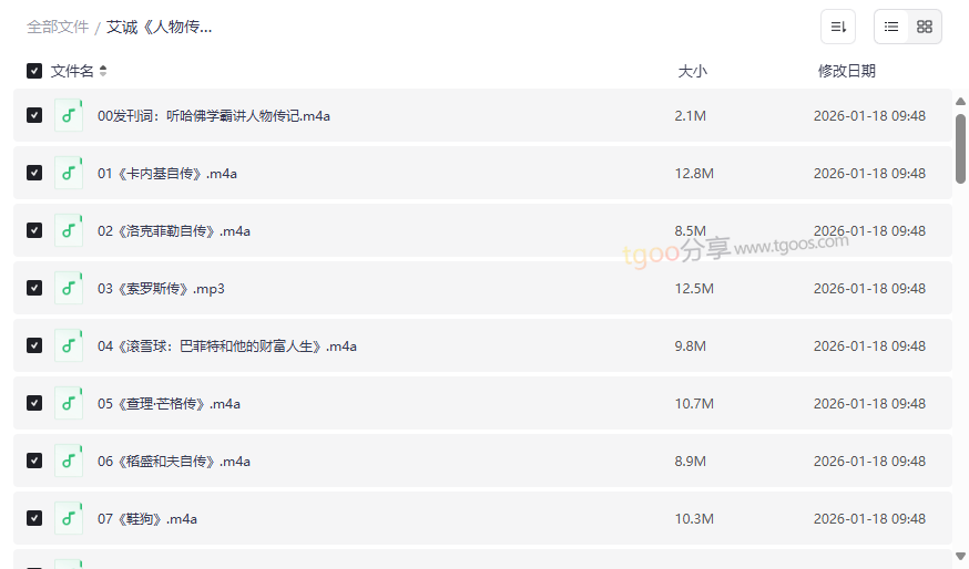 无论是通勤路上、运动间隙还是睡前时光,这套人物传记音频资源都能让你在碎片化时间里,完成一次高质量的思想充电。