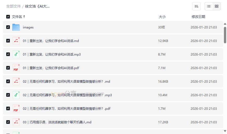 这是本资源的核心价值所在。每一讲都配备了Markdown文稿、MP3音频和图文PDF三种格式,满足不同场景下的学习需求。你可以通勤时听音频磨耳朵,在电脑上精读Markdown文稿并实践代码,或通过PDF进行划重点复习。这种设计极大地提升了学习的灵活性和效率,确保了知识的全方位吸收。- 从“与AI对话”到“快速开发应用” —— 课程内容循序渐进,从最基础的提示工程入门,到情感分析、文本分类等实战项目,最终引导你独立开发AI应用,形成完整闭环。