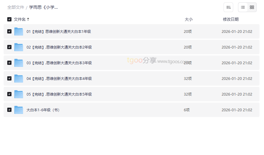 学而思《小学数学思维创新大通关》(俗称“大白本”)是面向小学阶段、旨在系统培养和拔高数学思维能力的经典教辅与课程体系。本资源集合了 1-6年级全套视频讲解课程(含“创新篇”与“优秀篇”双版本)以及配套的电子书教材,将抽象的数学思维具象化、趣味化,为学有余力或渴望突破的孩子提供了完整的进阶学习路径。这套高质量网盘资源尤其适合: