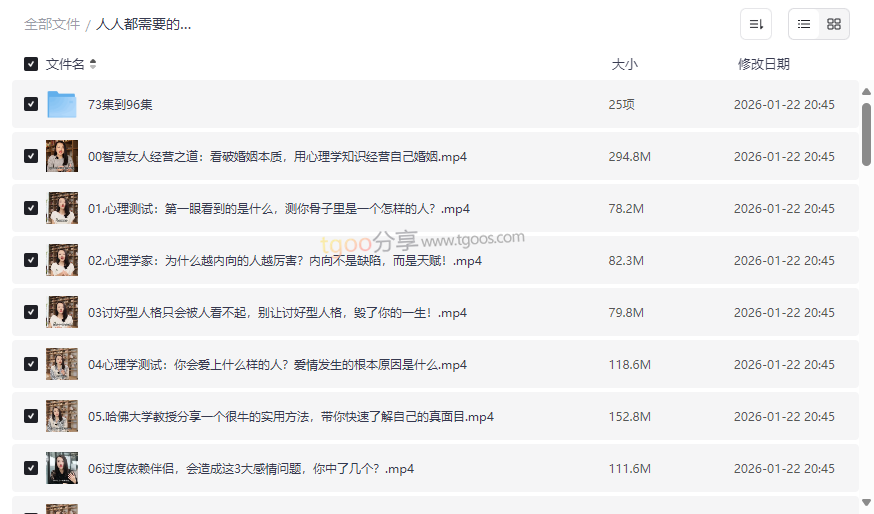 在当今快节奏的社会中,婚恋关系与个人心理健康已成为现代人普遍关注的焦点。这份名为 《人人都需要的婚恋社会心理学96节》 的高质量网盘资源合集,正是为此量身打造的系统性心理课程。它巧妙地将社会心理学、亲密关系经营、原生家庭影响、情绪管理与潜意识开发等多个维度融为一体,旨在帮助用户从根源上理解情感模式,提升经营幸福的能力。本资源不仅剖析了假性亲密、回避型依恋、精神内耗等常见情感困境,更提供了诸如非暴力沟通、心理暗示、吸引力法则等大量实用技巧。这套婚恋心理学课程适合: