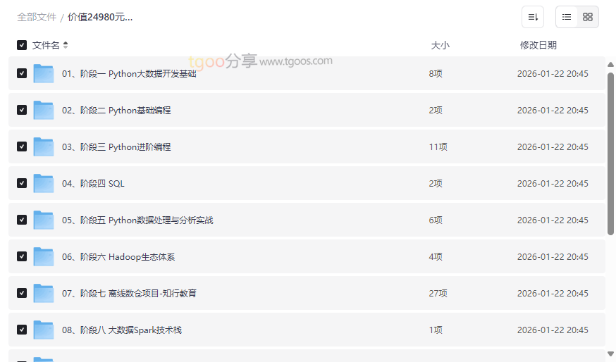 在数据驱动决策的时代,掌握Python编程大数据技术已成为进入高薪技术领域的黄金钥匙。本资源集合了价值24980元的“黑马程序员Python+大数据年度钻石会员”全套课程,14个阶段完整无密,内容从零基础入门到企业级项目实战,构建了从数据开发基础、数据处理分析、Hadoop/Spark/Flink生态技术栈,到离线/实时数仓综合项目的完整知识体系。这套高质量网盘资源合集专为渴望系统转型或深度提升的开发者设计,其价值不仅在于全面的知识覆盖,更在于贴近企业需求的实战项目训练,是通往大数据开发工程师、数据分析师、算法工程师等热门岗位的高效路径。