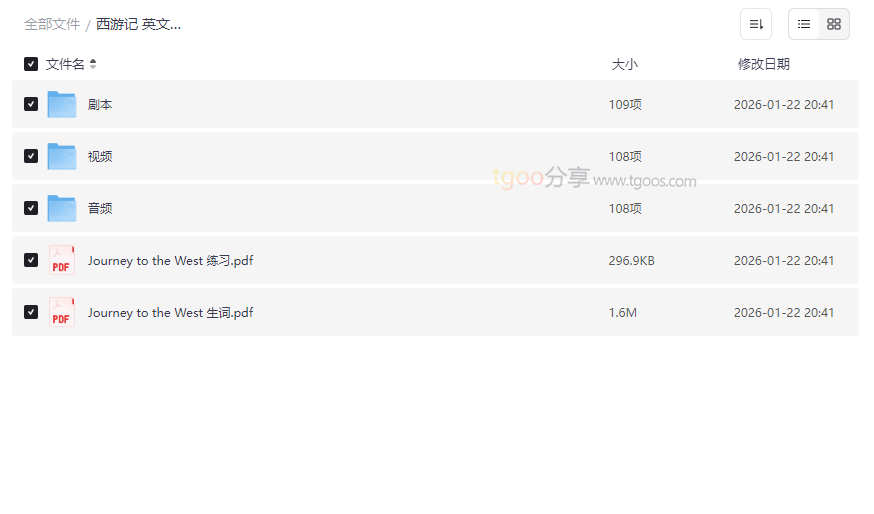 资源地址:《西游记英文版动画全集》96集高清视频+音频剧本+学习资料网盘下载