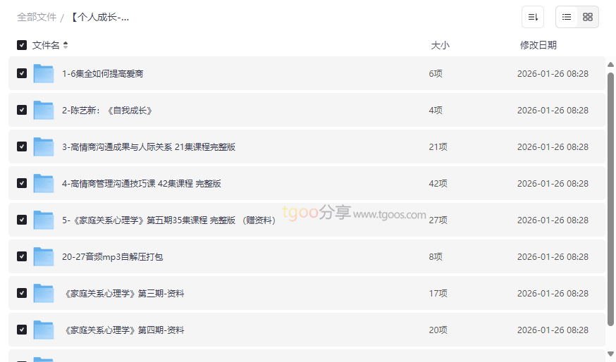 “陈艺新心理学课程”是知名心理学导师陈艺新老师倾力打造的个人成长与关系心理学系统课程。本资源合集堪称一座个人成长与幸福关系的宝库,深度整合了 《如何提高爱商》、《自我成长》、《高情商沟通》、《高情商管理沟通》以及《家庭关系心理学》 五大核心模块,并附赠海量配套讲义、笔记、作业及冥想音频。课程体系化地覆盖了从内在自我探索到外部关系经营的完整闭环,将心理学理论与生活实践紧密结合,旨在帮助学习者构建强大的内心世界,提升爱的能力与沟通智慧。这套高质量网盘资源合集适合: