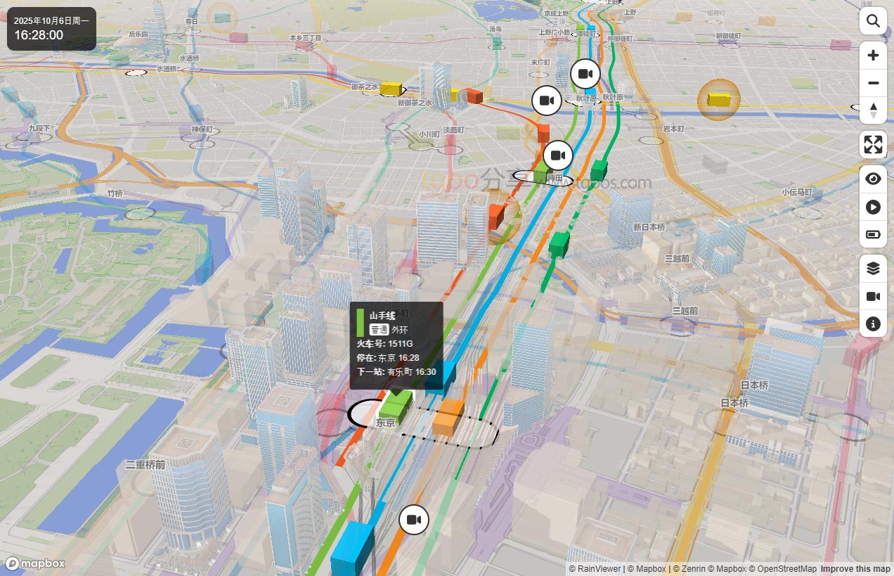 • 实时交通可视化:通过3D地图实时显示东京各条铁路线路的列车运行位置、速度和方向,帮助用户掌握当前交通状况。典型场景包括通勤路线规划、交通拥堵分析和公共交通系统研究,相比传统时刻表更直观反映实际运行状态。