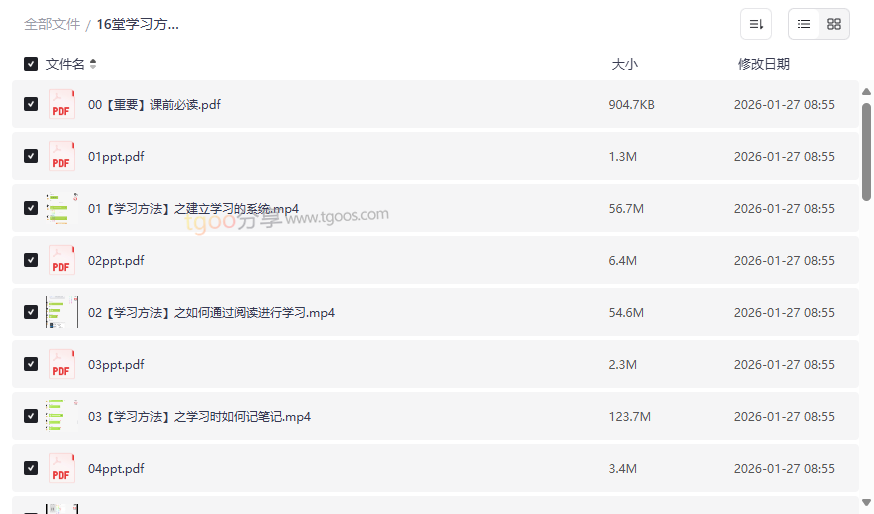 在信息爆炸的时代,拥有高效的学习方法比单纯积累知识更为重要。这份 “16堂学习方法系统课” 资源,正是为渴望突破学习瓶颈、实现个人高速成长的你量身打造。它并非零散的技巧堆砌,而是一套从 “学习方法”“知识管理” 再到 “时间管理” 的完整成长系统。本资源集合了 高清视频课程、配套PPT讲义以及详尽的课前指南,旨在帮助你构建底层学习逻辑,将碎片化信息转化为体系化能力,真正实现事半功倍的学习效果。这套系统课程尤其适合: