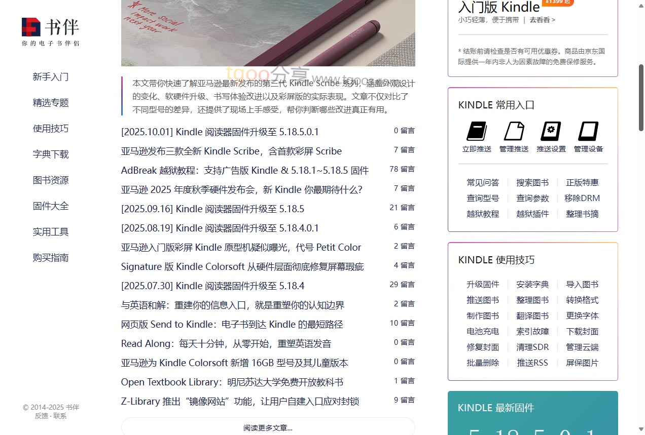 书伴(BookFere)是一个专注于Kindle电子书阅读器使用技巧与资源分享的在线平台,提供固件升级指南、字典下载、推送服务与越狱教程等核心内容,帮助Kindle用户、电子书爱好者与阅读社群更便捷、深入地使用设备,提升阅读体验与设备利用率。据公开信息,该站点汇集了丰富的Kindle技巧、固件更新信息与自定义资源,覆盖从基础操作到高级优化的多种场景,如Kindle固件升级、字典安装、电子书推送与个性化设置,旨在让读书成为生命的一部分,支持用户持续探索与学习。平台内容以中文为主,免费访问,无需特殊网络条件;其特色在于系统化整理Kindle相关知识与工具,并提供实践指导,适合新手快速上手与资深用户挖掘设备潜力。