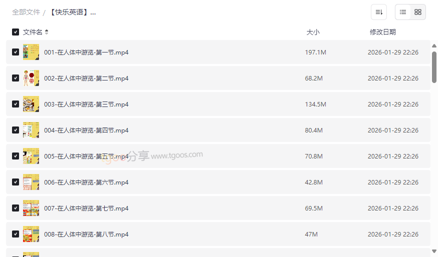 跟随神奇校车缩微进入人体,展开一场从口腔到细胞的神奇旅行。能能老师用浅显易懂的语言讲解消化系统、血液循环等复杂知识,同时融入大量身体部位、动作相关的基础英语词汇。亮点在于将抽象的生物学知识视觉化、故事化,让孩子在了解自己身体的同时,轻松掌握如“heart心脏”、“bone骨骼”等实用英语单词。 - 《追寻恐龙》系列(22节)