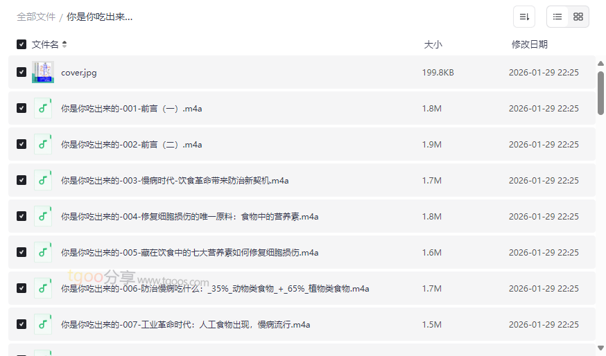 - 系统完整:超过160个音频文件,覆盖两册书全部核心内容,构成一个完整的健康饮食音频课程体系。