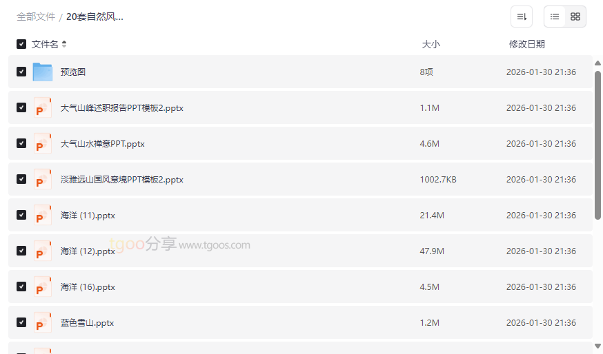 在当今的职场汇报、学术展示与个人分享中,一份设计精美、主题契合的PPT无疑是成功的关键。本资源精心整理了 20套高质量自然风光PPT模板,囊括了 壮阔山峰、宁静海洋、淡雅山水、清新绿意 等多元自然元素。这些模板不仅提供了视觉上的震撼与享受,更将自然之美与专业排版设计完美融合,旨在帮助用户快速打造出令人过目不忘的演示文稿。无论是追求大气磅礴的商务风格,还是偏爱清新雅致的文艺格调,这份免版税、可编辑的网盘资源合集都能满足您的需求,极大提升制作效率与演示效果。