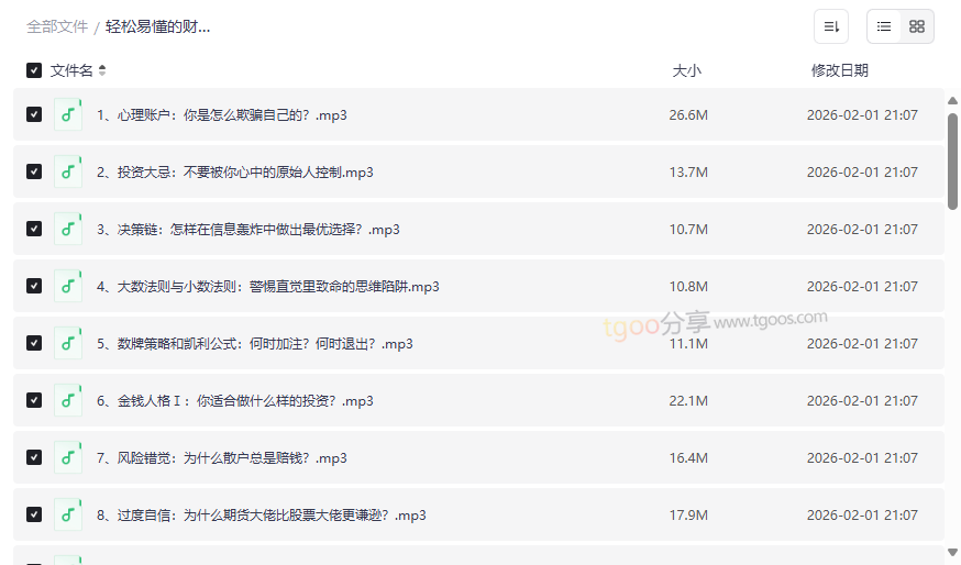 在瞬息万变的金融市场中,知识固然重要,但决定成败的往往是投资者的心智模式与行为习惯。本套《轻松易懂的财商课》正是这样一份直击核心的投资心理学实战指南。它并非枯燥的理论堆砌,而是通过36节精心设计的音频课程,系统剖析了从“心理账户”、“风险错觉”到“芒格智慧”等关键心理陷阱与思维模型。本资源集合了行为金融学精髓、巴菲特股东大会见闻、心智修炼访谈等多维度内容,将深奥的投资哲学转化为可听、可学、可用的日常思维训练,旨在帮助每一位学习者重塑金钱观,成为更理性、更从容的经营与赚钱达人。这套高质量网盘资源尤其适合: