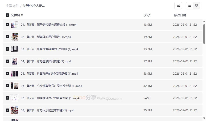 在人人皆可自媒体的时代,如何从海量内容中脱颖而出,打造具有强辨识度和商业价值的个人IP,是每个内容创作者和创业者的核心课题。本套《差异化个人IP打造实操课程》正是为此而生,它并非空泛的理论,而是一套从账号定位、人设搭建、内容创作到流量变现的完整实操指南。课程深度剖析了抖音等新媒体平台的底层逻辑,提供了大量可直接套用的方法论与表格工具,旨在帮助学习者构建可持续盈利的个人品牌资产。本资源集合了全套高清视频课程及辅助资料,是您进军新媒体、实现知识变现商业增长的强力引擎。