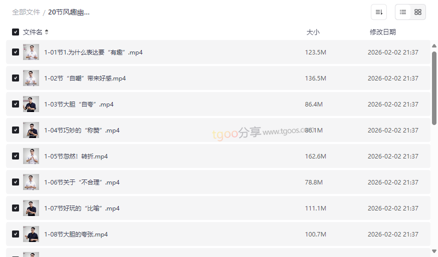在人际交往与职场沟通中,风趣幽默的表达不仅是打破僵局的利器,更是提升个人魅力、建立深度连接的秘密武器。本套《20节风趣幽默表达的秘籍课程》正是这样一套系统化、实战化的沟通技巧提升宝典。课程从底层逻辑到高阶应用,层层递进,不仅教你“说什么”,更教你“怎么说”,将幽默感从一种天赋转变为可以习得的技能。这套高质量网盘资源汇集了20节核心课程与加餐内容,通过生动的案例与实用的技巧,帮助学习者在各种社交与工作场景中游刃有余。