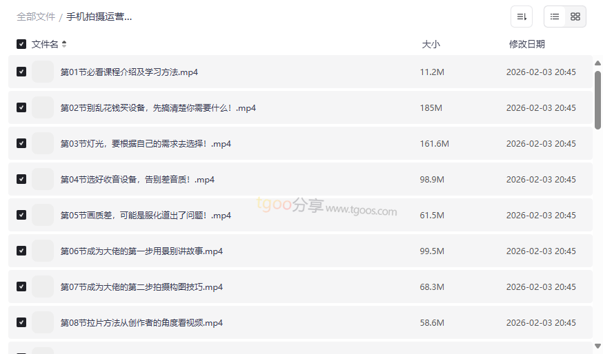 在短视频内容为王的时代,掌握手机拍摄与运营的核心技能已成为个人创作者和品牌方脱颖而出的关键。本套《手机拍摄运营各赛道实战课》资源,正是为这一需求量身打造的系统性解决方案。它从 “设备选择、灯光收音、拍摄构图” 等底层技术,到 “美食、好物、旅拍、口播” 等热门赛道的实战演练,再到 “账号搭建、爆款选题、运营变现” 的完整闭环,提供了一条从0到1、从1到N的清晰成长路径。这套高质量网盘资源合集的价值在于,它摒弃了华而不实的理论,直击创作与运营中的真实痛点,让学习者能够即学即用,快速上手。