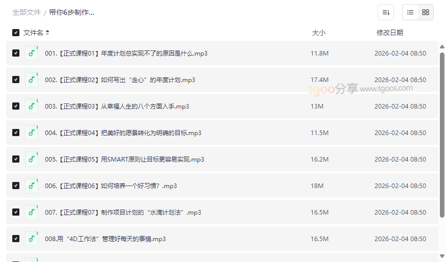 你是否也曾满怀信心地写下新年目标,却在年底发现它们依然停留在纸上?告别“年初立Flag,年底打脸”的循环,关键在于掌握一套科学、系统且可执行的方法。本资源《带你6步制作可实现的年度计划》正是这样一套专为“计划困难户”量身打造的实战指南。它由知名时间管理专家邹小强精心打造,从剖析计划失败的根本原因入手,逐步引导你写出“走心”的目标,并运用SMART原则、习惯养成法、水滴计划法、4D工作法等经典工具,将模糊的愿景落地为清晰的行动路径。这套音频课程资源,将为你提供从“想到”到“做到”的全套思维与行动框架。