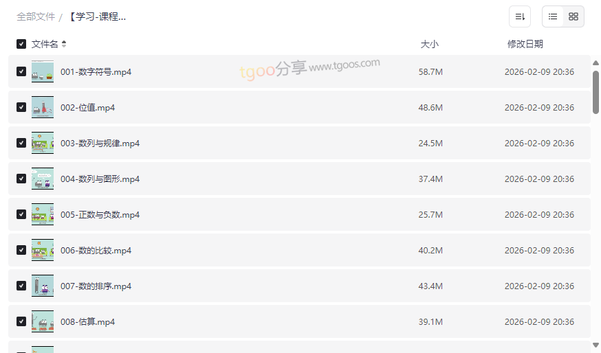这是数学大厦的基石。课程从“数字符号”和“位值”讲起,用动画直观展示个、十、百、千位的意义。随后引入“数列与规律”、“正数与负数”,帮助孩子建立完整的数系概念。亮点在于将“估算”和“四舍五入”这类实用技能生活化,让孩子明白数学不仅是做题,更是解决实际问题的工具。 - 数论核心概念模块(第010-016集)