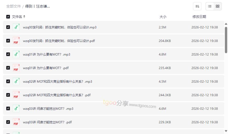 在当今竞争激烈的商业环境中,消费者的每一次接触都可能决定品牌的成败。得到丨汪志谦:MOT 体验设计课 正是这样一套系统性的商业战略课程,它由知名品牌营销专家汪志谦倾力打造,深度解析了如何通过设计 关键时刻(Moment of Truth, MOT) 来撬动商业增长。本资源完整收录了课程的 全部15讲音频与配套PDF文稿,将抽象的体验设计理论转化为可落地、可执行的商业洞察工具,是品牌操盘手、创业者、产品经理及市场从业者不可多得的实战宝典。这套 高质量网盘资源 适合: