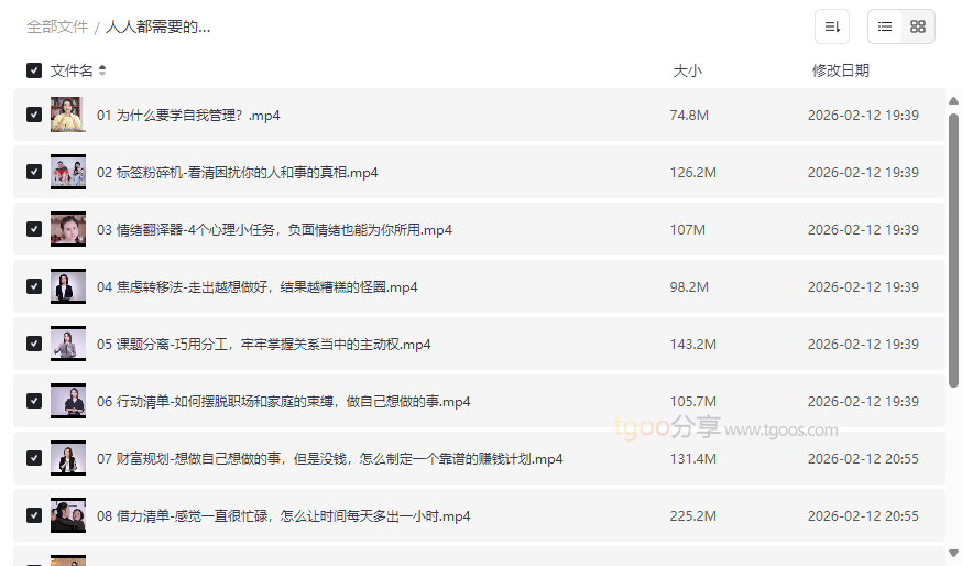 在快节奏的现代生活中,你是否常常感到被情绪、关系、时间和金钱所困扰,陷入“越想做好,结果越糟糕”的怪圈?这份《人人都需要的自我管理课》正是为你量身打造的系统性人生管理工具箱。它超越了传统的时间管理,从心理认知、情绪调节、关系处理、财富规划四大核心维度切入,提供了一套即学即用的实战方法论。本资源集合了完整的视频课程,通过生动的案例与清晰的步骤,帮助你从内在认知到外在行动实现全面升级。无论你处于人生的哪个阶段,这套课程都能提供强大的支持: