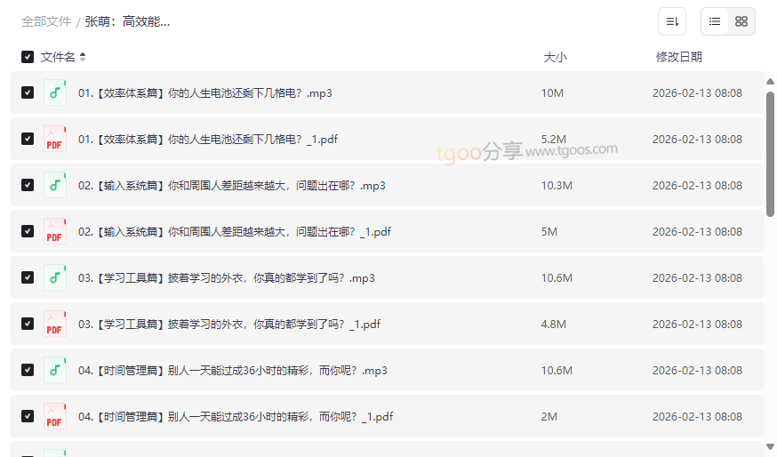 资源地址:张萌《高效能人生的自我管理》课程全集:音频+讲义PDF网盘资源免费下载