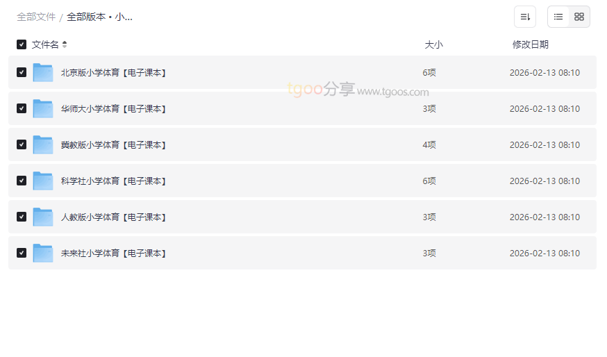在“健康第一”的教育理念下,小学体育课程是孩子们强健体魄、培养运动兴趣的基石。然而,不同地区、不同学校使用的体育教材版本各异,为家长和教育工作者的备课、辅导带来了不便。本资源集合了 北京版、华师大版、冀教版、科学社版、人教版、未来社版 等六大主流版本的 小学体育电子课本,覆盖 1-6年级全学段,所有文件均为 高清PDF格式,堪称一份 权威、全面、便捷的体育教学数字图书馆。这份 高质量网盘资源合集 特别适合:
