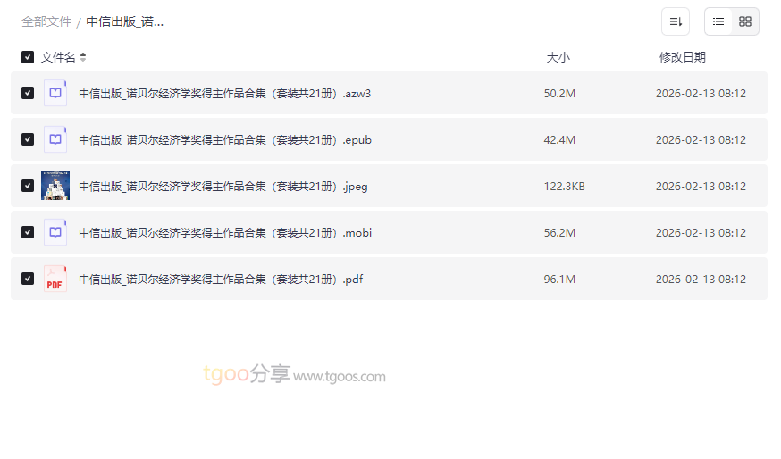 诺贝尔经济学奖,作为社会科学领域的最高荣誉之一,其获奖者的思想深刻影响着全球的经济政策、商业决策与个人生活。本资源《中信出版_诺贝尔经济学奖得主作品合集(套装共21册)》正是这样一座思想的宝库,它系统性地收录了多位诺奖得主的经典著作,由国内顶尖出版机构中信出版社精心编译推出。合集以 AZW3、EPUB、MOBI、PDF 四种主流电子书格式呈现,并附有封面图片,确保了在不同阅读设备上的完美兼容性与阅读体验。这套合集的价值在于,它将散落各处的经济学智慧凝聚一体,为读者提供了一条通往顶级经济思维的捷径,无论是想理解复杂的经济现象,还是寻求个人财富与决策的理性指引,这套书都不可或缺。