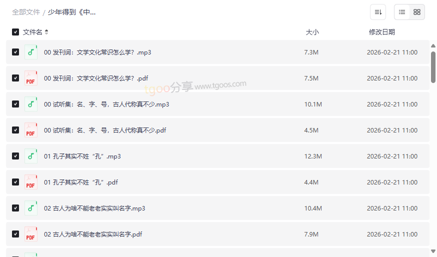 无论是用于日常积累、考前复习,还是作为通识教育的兴趣启蒙,这份 高质量、体系完整的音频课程资源 都能让学习过程变得像听故事一样轻松愉快,实现知识点的长效记忆。