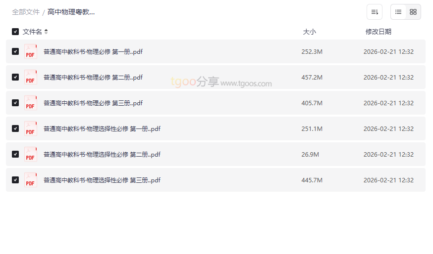 “高中物理粤教版”是广东省及部分使用粤教版教材地区高中生的核心学习资料。本资源集合了 全套必修与选择性必修共六册的官方电子教材,内容权威、编排科学,严格遵循新课标要求,是学生系统学习物理知识、教师备课教学的必备工具。这套高质量网盘资源合集将厚重的纸质课本数字化,方便随时随地查阅与学习,尤其适合: