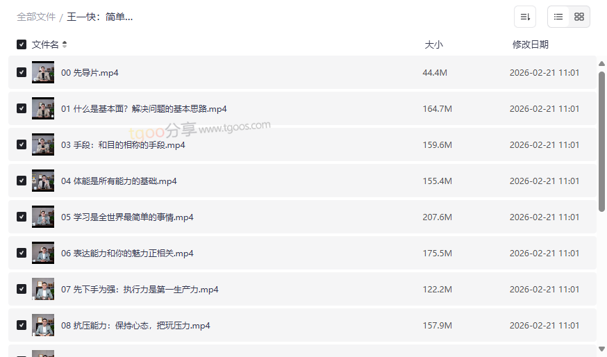 在快节奏的现代生活中,个人成长与自我提升已成为职场人士与青年学生的核心关切。然而,市面上许多课程要么过于理论化,要么枯燥乏味,难以坚持。王一快的《简单有趣的自我成长课堂》正是为解决这一痛点而生。本资源集合了 16节核心视频课程,以轻松幽默的叙事风格,将深刻的成长智慧拆解为可执行、可感知的日常方法。课程从“基本面”出发,覆盖了体能、学习、表达、执行力、抗压、谋划、心态、人际等个人发展的全方位维度,堪称一部系统化的“成年人成长使用手册”。这套高质量网盘资源尤其适合: