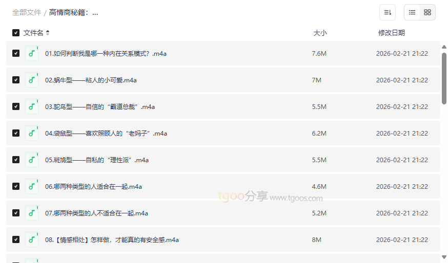 在快节奏的现代社会中,人际关系已成为影响个人幸福感与事业发展的核心因素。你是否在亲密关系中感到疲惫?在职场中感到掣肘?或是在家庭沟通中充满无力感?这份名为“高情商秘籍:搞定复杂的人际关系”的完结版音频课程,正是为你量身打造的关系破局指南。课程创造性地提出了“内在关系模式”理论,将人格类型生动地比喻为蜗牛型、鸵鸟型、袋鼠型、斑鸠型,并以此为基石,系统性地剖析了情感、职场、自我成长、家庭关系四大核心场景中的复杂互动。本资源集合了32节深度音频课,旨在帮助你: