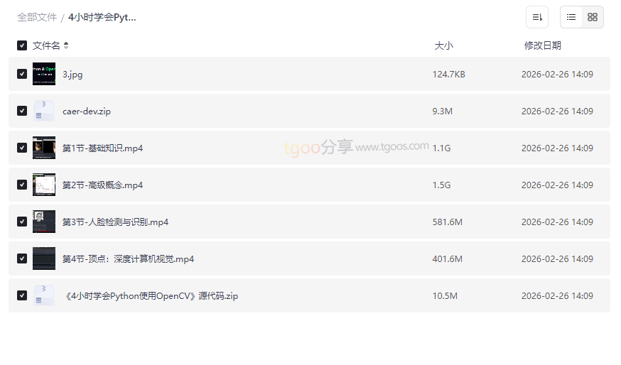 在人工智能与计算机视觉蓬勃发展的今天,掌握图像处理的核心技能已成为开发者的重要竞争力。本资源《4小时学会Python使用OpenCV》是一套高度浓缩、实战导向的速成课程,旨在帮助学习者快速上手这一强大的计算机视觉库。资源集合了 从基础到高级的完整视频教程、配套源代码以及核心学习素材,将复杂的图像处理概念转化为清晰易懂的实践操作。无论你是: