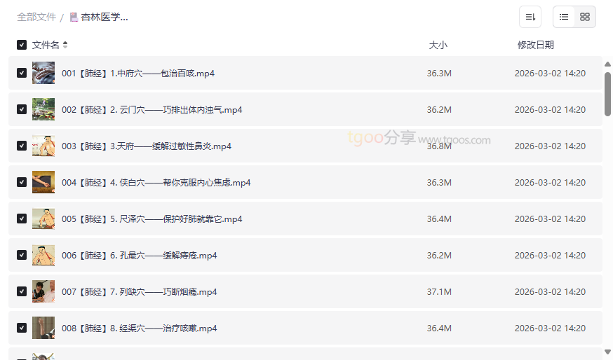 “杏林医学苑·穴位一病一讲”是一套系统、全面的中医经络穴位自学视频课程。本资源以“一病一穴”为核心,通过 232集高清视频,深入浅出地讲解了人体十二正经及任督二脉中超过250个关键穴位。课程将深奥的经络学说与日常健康问题紧密结合,针对性地解决从感冒咳嗽、失眠头痛,到脾胃不和、腰腿疼痛等上百种常见不适。这套高质量网盘资源合集,将传统中医智慧转化为可操作的家庭保健指南,适合: