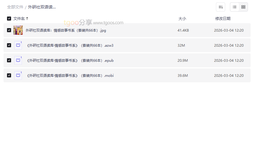 这是本资源的灵魂所在,66本图书构成了一个丰富的情感宇宙。书系主题明确,聚焦于“情感”,收录了众多关于亲情、友情、爱情及人生哲理的短篇佳作。采用中英双语左右对照或分段对照的排版方式,使读者在享受文学之美的同时,可以随时参考译文,理解难点,学习效率倍增。对于希望通过阅读学英语的用户来说,这避免了频繁查词典的打断,让阅读过程流畅而充满乐趣。 - 三大主流电子书格式(AZW3/EPUB/MOBI)