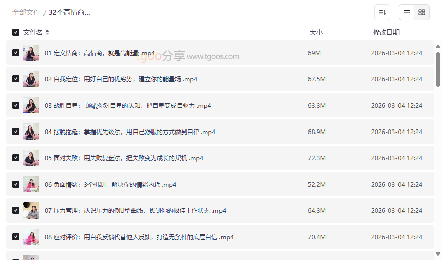 在竞争日益激烈的现代社会,情商(EQ)已成为决定个人职业发展、人际关系和生活幸福感的关键软实力。本资源《32个高情商公式建立自己的优势》由知名经纪人、职场导师杨天真倾力打造,是一套系统化、可操作的高情商修炼指南。它从自我认知、情绪管理、高效沟通、主动职场、人脉经营到个人品牌,全方位拆解了32个核心公式,并辅以15个真实案例课,将抽象的情商概念转化为具体可执行的行动步骤。这套高质量网盘资源合集旨在帮助用户不仅理解情商,更能运用情商,在复杂环境中建立并巩固自己的独特优势。