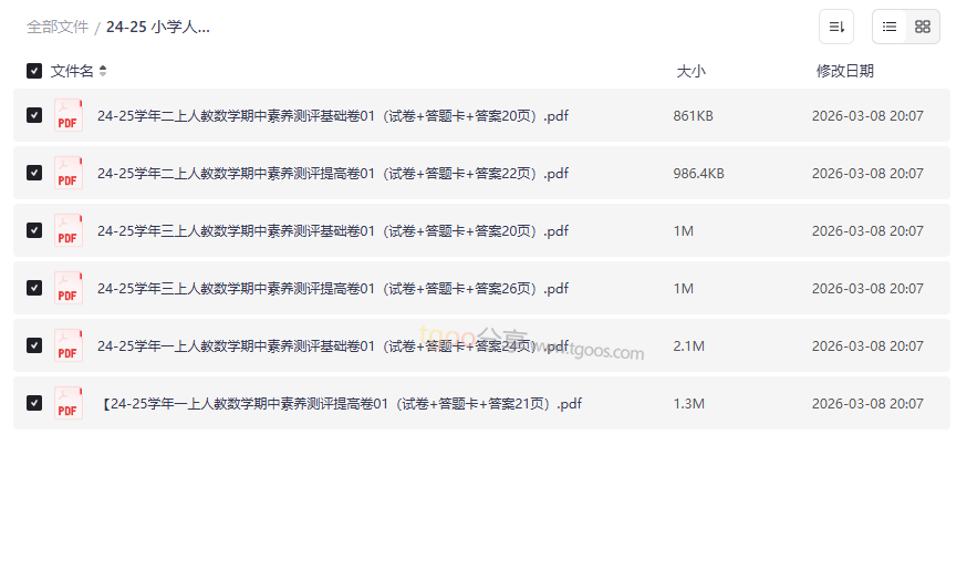 随着教育改革的深入,数学核心素养的培养已成为小学阶段的重中之重。本资源精心整理了 24-25学年小学人教版数学期中素养测评卷,覆盖一至三年级上册,每套资源均包含 完整试卷、标准答题卡及详细答案解析 的PDF文件。这套资源不仅是对教材知识的巩固,更是对学生逻辑思维、应用能力和应试技巧的综合性提升工具,旨在帮助孩子精准把握期中考试方向,实现高效复习与能力拔高。它特别适合: