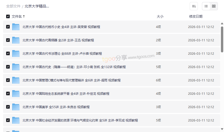 “北京大学精品课程32套”是一份汇集了中国顶尖学府学术精华的珍贵数字资源库。本资源包精选了北京大学在人文历史、社会科学、艺术美学、法学经济及前沿交叉学科等多个领域的32门经典视频课程,由吴荣曾、邓小南、张帆、朱良志、温儒敏、张千帆等北大知名教授与学者亲自讲授。这些课程不仅是北大校内教学的精华,更是面向社会公众开放的高质量通识教育与专业深造的绝佳材料,其价值在于将象牙塔尖的深邃思想与系统知识,以视频形式普惠于广大学习者。这份完整的北京大学网盘资源合集尤其适合: