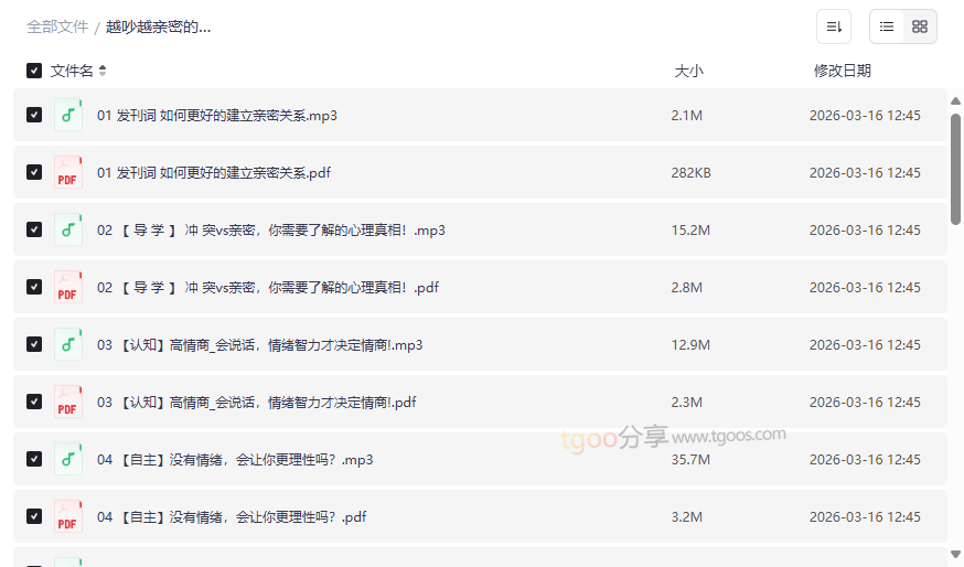 你是否曾因争吵而感到关系破裂,或因沟通不畅而陷入冷战?《越吵越亲密的哈佛亲密关系攻略》正是为你量身打造的高情商沟通指南。这套资源源自前沿心理学与哈佛大学的研究精华,颠覆了“避免冲突才能维系关系”的传统观念,提出“建设性冲突”才是关系升温的催化剂。本资源集合了 16节核心音频课程及配套PDF文稿,系统性地从认知情绪、管理冲突到实战应用,为你提供一套可操作的15天情商提升方案。它不仅是情感修复手册,更是个人成长的加速器,适合: