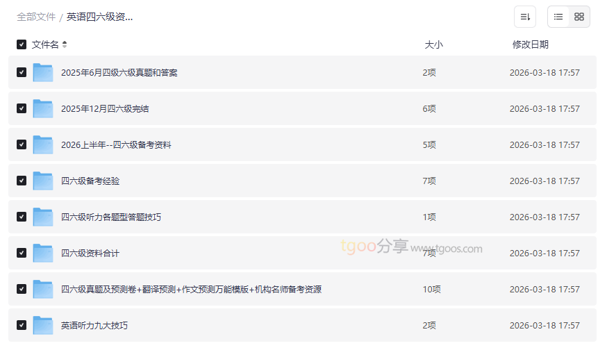 对于每一位中国大学生而言,英语四六级考试不仅是学业上的重要关卡,更是未来升学、求职的必备证书。面对听力、阅读、写作、翻译四大板块的挑战,系统、高效的备考资料至关重要。本资源库精心整合了 2025-2026年最新真题与答案、名师全程班网课、分项突破资料、权威预测押题以及海量备考经验,构建了一个从基础夯实到考前冲刺的完整学习闭环。这套高质量网盘资源合集旨在帮助考生打破信息差,实现高效备考,尤其适合: